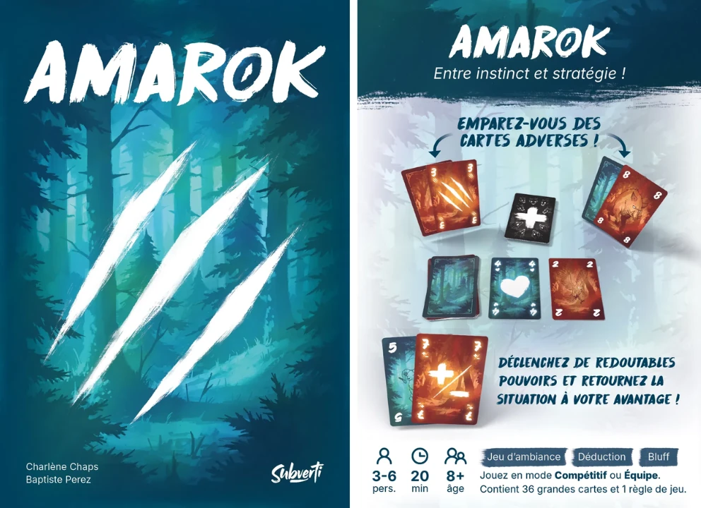 Amarok est un jeu de cartes et d’ambiance imaginé par Charlène Chaps, illustré par Baptiste Perez et édité par Subverti. Il sort le 30 janvier 2026 et il se joue de 3 à 6 joueurs, dès 8 ans, pour des parties d’environ 20 minutes. Cette présentation est basée sur une version offerte par l’éditeur.