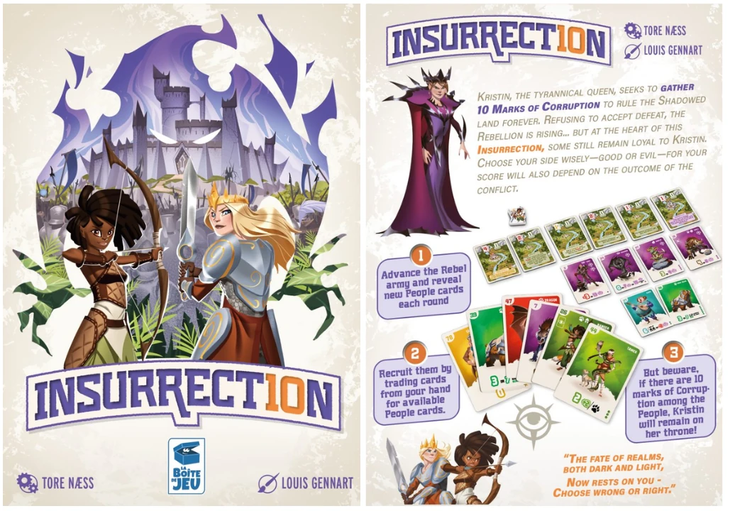 Dans Insurrection, vous incarnez un chef rebelle qui recrute des alliés sur la route menant à la Forteresse de la Reine Kristin. La partie peut s’achever de deux façons : si les rebelles tiennent jusqu’au bout de la 6e manche, le Bien l’emporte ; si l’ombre accumule 10 marques de Corruption au centre de la table, le Mal triomphe. Dans tous les cas, c’est le joueur ayant le plus de points qui gagne la partie.