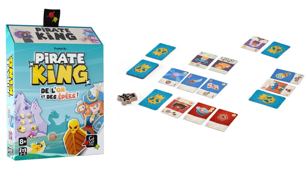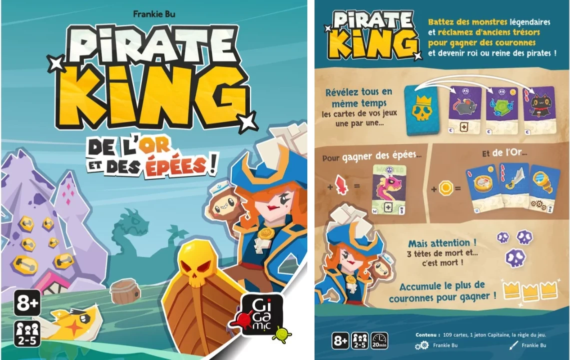 Pirate King est un jeu de cartes stop ou encore créé et illustré par Frankie Bu et édité en Frances par Gigamic. Il se joue de 2 à 5 joueurs, dès 8 ans, pour des parties d’environ 20 minutes. Cette présentation est basée sur une version offerte par l’éditeur.