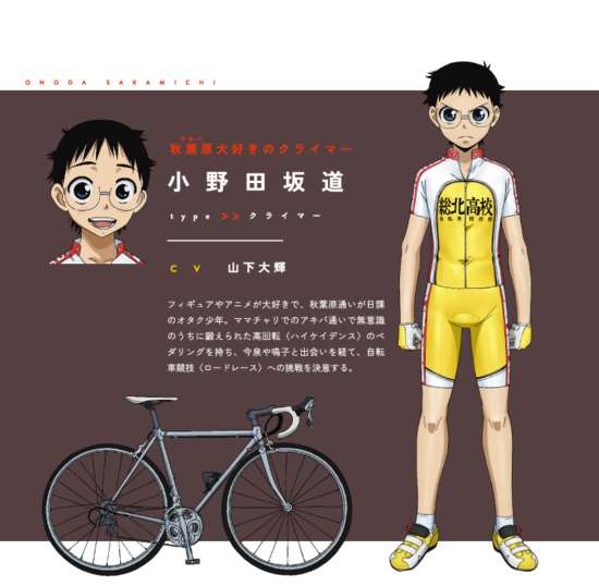 Yowamushi Pedals (En selle, Sakamichi) est une série sur le cyclisme. L’histoire est celle de Sakamichi Onoda, un jeune lycéen, otaku, dont le plus grand souhait est de se faire des amis partageant la même passion que lui. Il est tellement à fond otaku qu’il prend régulièrement son vélo pour aller à Akihabara alors que cela représente 90km de trajet vallonné. Très vite, dans son lycée il va faire la connaissance des membres du club de cyclisme qui se rendent compte qu’il a un certain talent pour monter les cols malgré un vélo qui n’est pas du tout adapté. Il va donc finalement se faire des amis mais pas dans le domaine auquel il pensait… Il rejoint le club avec deux autres nouveaux qui sont, eux, déjà des habitués des courses depuis le collège. L’équipe est composée principalement de :